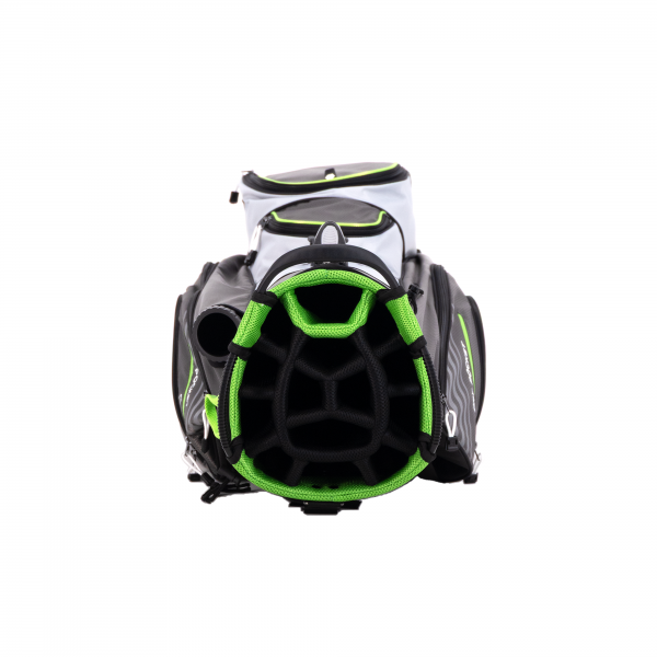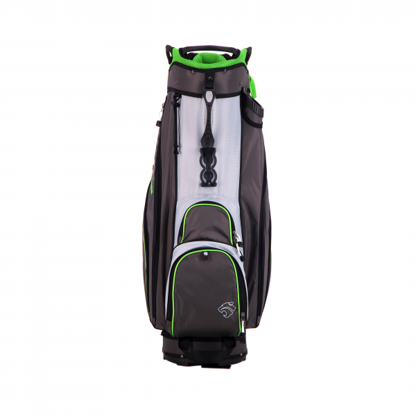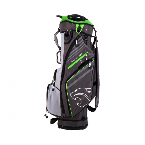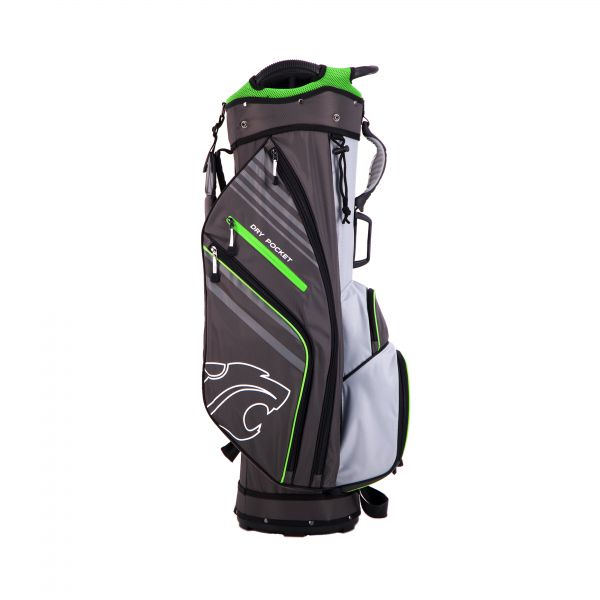 The Cougar Silvercat VII Cart Bag combines style and functionality with a 14-way top divider, multiple storage options, and convenient features like an insulated cooler pocket and internal putter tube—perfect for golfers who demand organization and ease on the course.